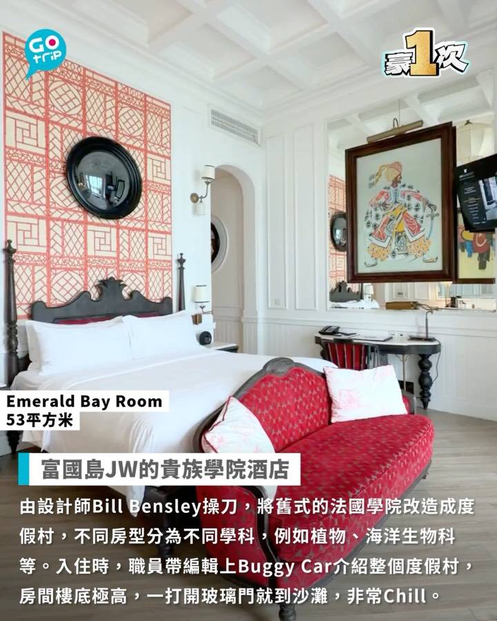 由設計師Bill Bensley操刀,將舊式的法國學院改造成度假村,不同房型分為不同學科,例如植物、海洋生物科等。Check in後,職員帶編輯上Buggy Car介紹整個度假村,職員力推必去貝殼泳池打卡,然後入住Emerald Bay Room,53平方米,房間樓底極高,一打開玻璃門就到沙灘,非常Chill。此外,亦有一本「入學手冊」,介紹酒店設施、服務,儀式感十足!