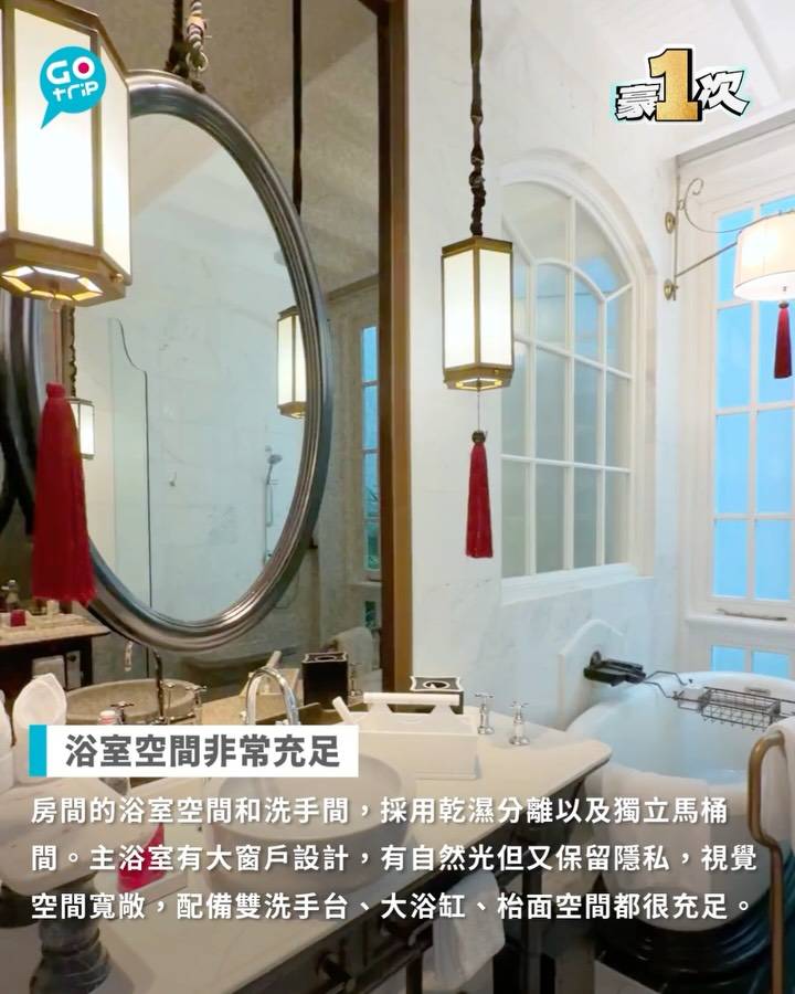 房間的浴室空間和洗手間,採用乾濕分離以及獨立馬桶間。主浴室有大窗戶設計,有自然光但又保留隱私,視覺空間寬敞,配備雙洗手台、大浴缸、枱面空間都很充足。