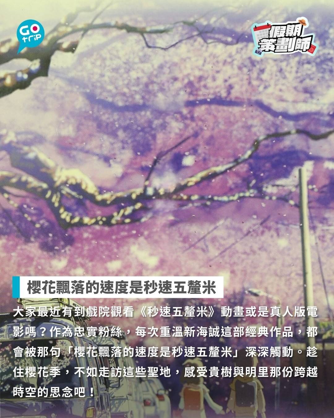 大家最近有到戲院觀看《秒速五釐米》動畫或是真人版電影嗎?作為忠實粉絲,每次重溫新海誠這部經典作品,都會被那句「櫻花飄落的速度是秒速五釐米」深深觸動。趁住櫻花季,不如走訪這些聖地,感受貴樹與明里那份跨越時空的思念吧!