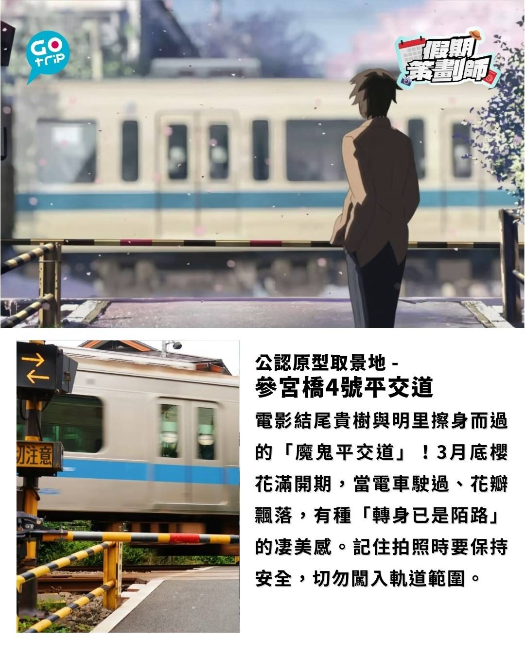 電影結尾貴樹與明里擦身而過的「魔鬼平交道」!3月底櫻花滿開期,當電車駛過、花瓣飄落,有種「轉身已是陌路」的凄美感。記住拍照時要保持安全,切勿闖入軌道範圍。