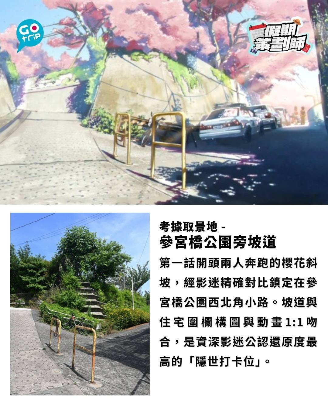 第一話開頭兩人奔跑的櫻花斜坡,經影迷精確對比鎖定在參宮橋公園西北角小路。坡道與住宅圍欄構圖與動畫1:1吻合,是資深影迷公認還原度最高的「隱世打卡位」。
