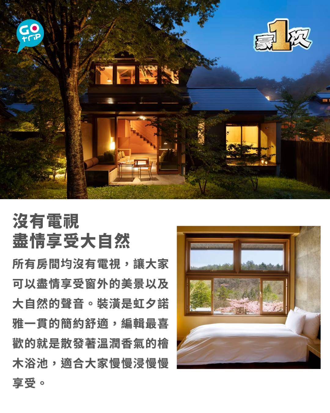 所有房間均沒有電視,讓大家可以盡情享受窗外的美景以及大自然的聲音。裝潢是虹夕諾雅一貫的簡約舒適,編輯最喜歡的就是散發著溫潤香氣的檜木浴池,適合大家慢慢浸慢慢享受。