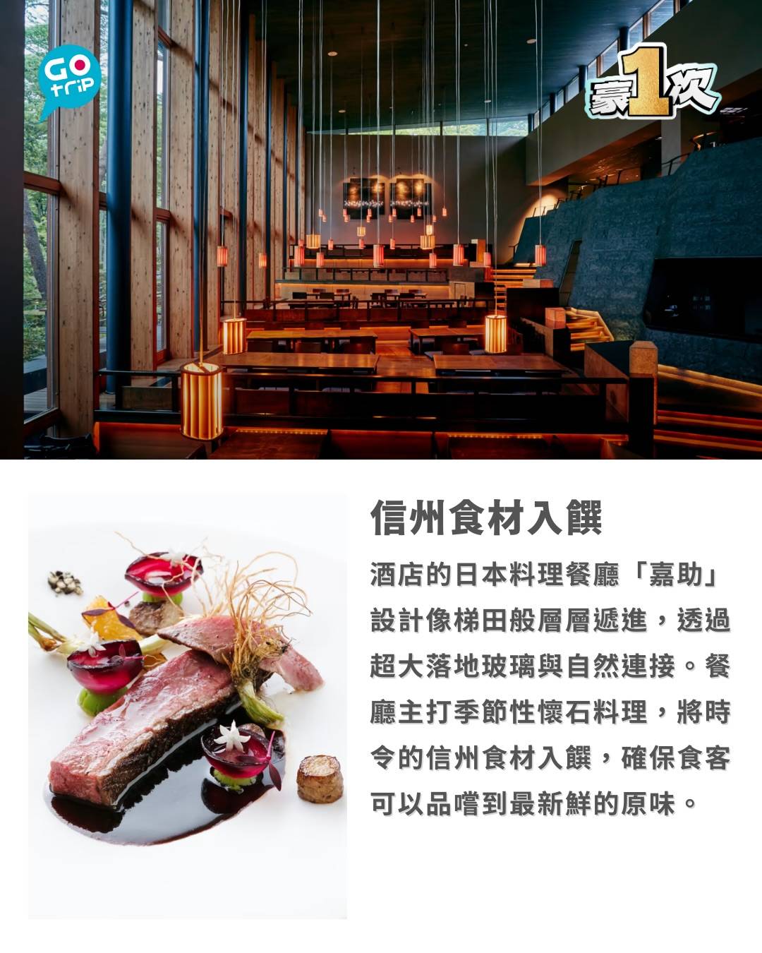 酒店的日本料理餐廳「嘉助」設計像梯田般層層遞進,透過超大落地玻璃與自然連接。餐廳主打季節性懷石料理,將時令的信州食材入饌,確保食客可以品嚐到最新鮮的原味。