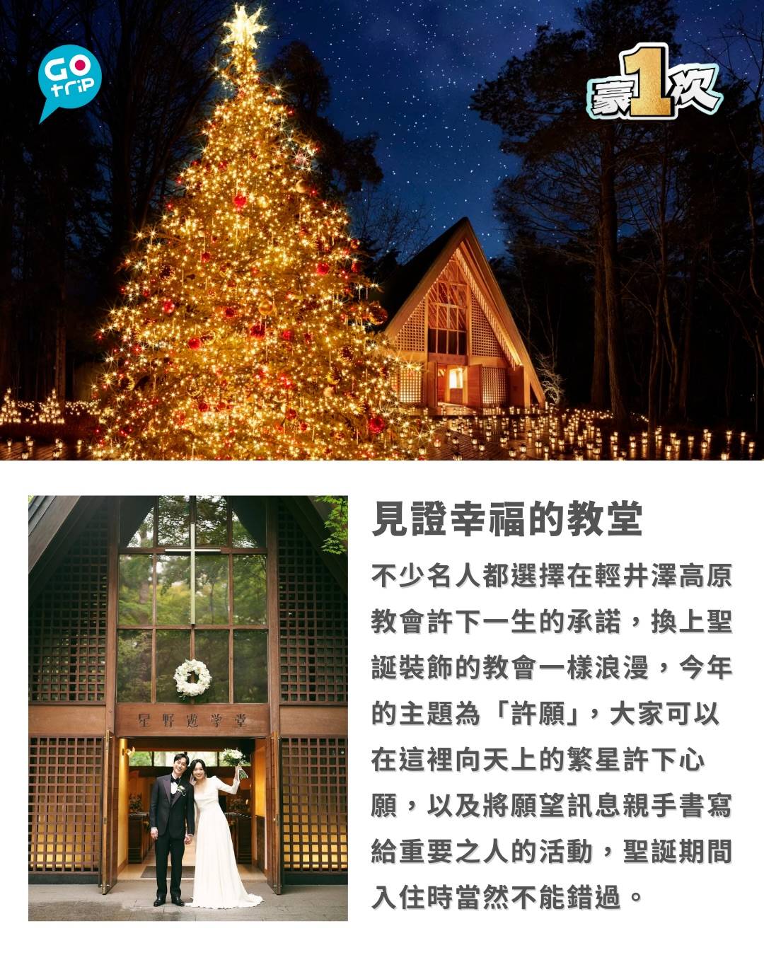 不少名人都選擇在輕井澤高原教會許下一生的承諾,換上聖誕裝飾的教會一樣浪漫,今年的主題為「許願」,大家可以在這裡向天上的繁星許下心願,以及將願望訊息親手書寫給重要之人的活動,聖誕期間入住時當然不能錯過。