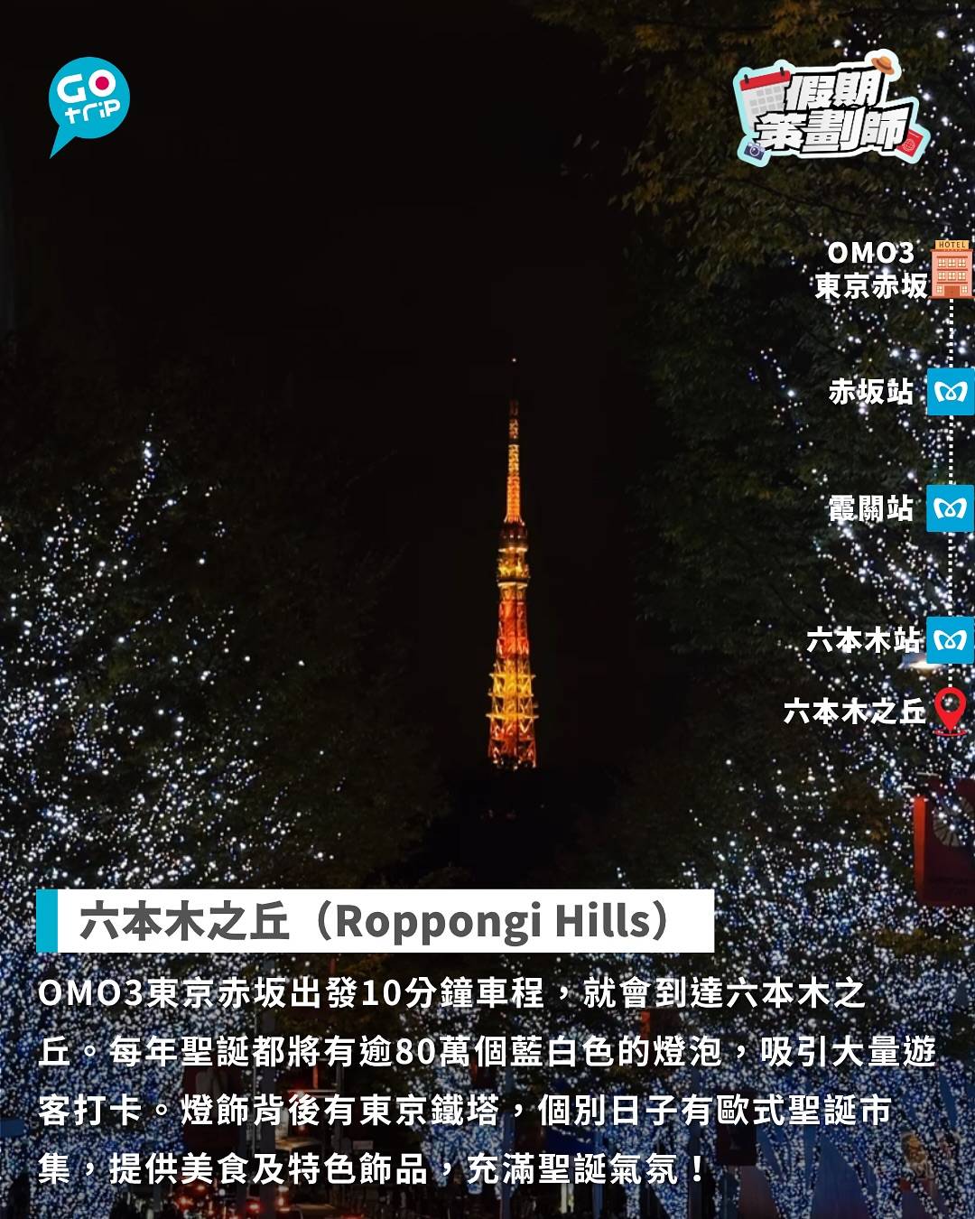OMO3東京赤坂出發10分鐘車程,就會到達六本木之丘。每年聖誕都將有逾80萬個藍白色的燈泡,吸引大量遊客打卡。燈飾背後有東京鐵塔,個別日子有歐式聖誕市集,提供美食及特色飾品,充滿聖誕氣氛!