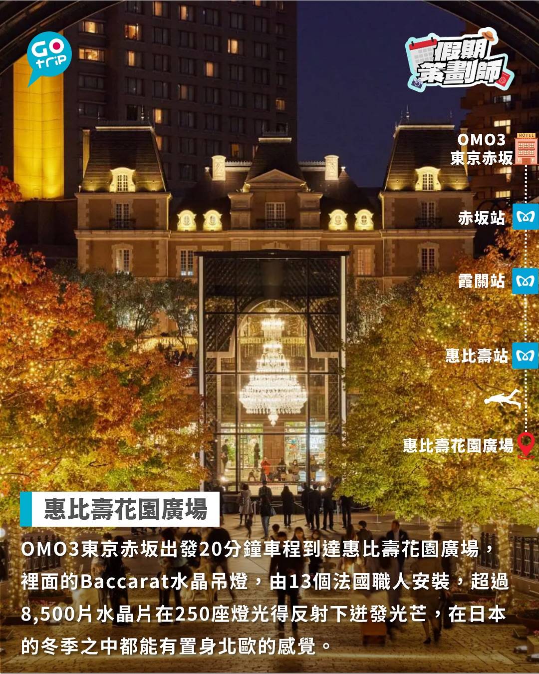 OMO3東京赤坂出發20分鐘車程到達惠比壽花園廣場,裡面的Baccarat水晶吊燈,由13個法國職人安裝,超過8,500片水晶片在250座燈光得反射下迸發光芒,在日本的冬季之中都能有置身北歐的感覺。