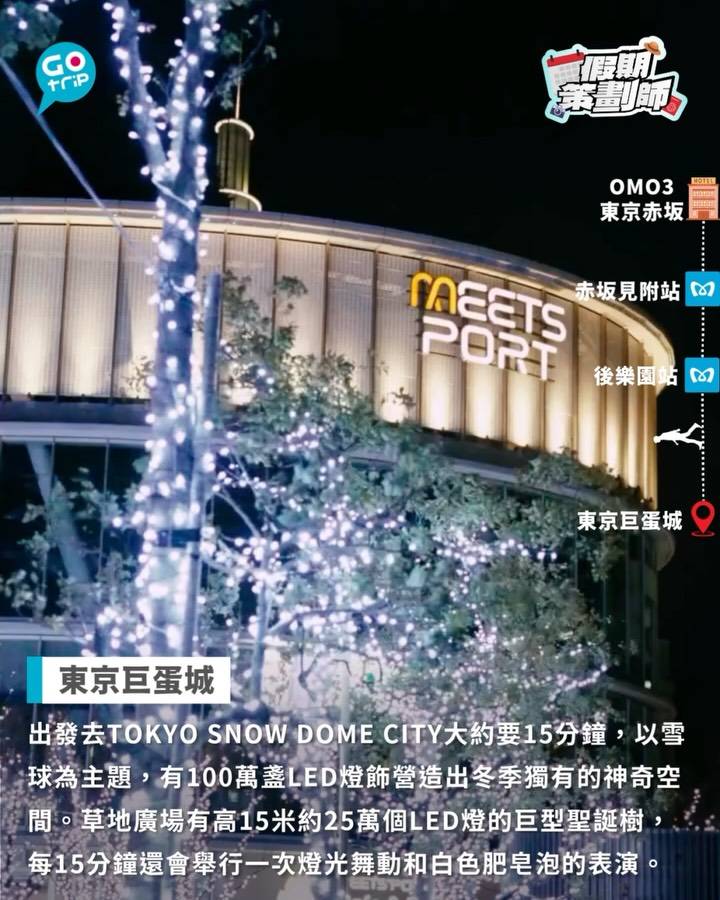 出發去TOKYO SNOW DOME CITY大約要15分鐘,以雪球為主題,有100萬盞LED燈飾營造出冬季獨有的神奇空間。草地廣場有高15米約25萬個LED燈的巨型聖誕樹,每15分鐘還會舉行一次燈光舞動和白色肥皂泡的表演。
