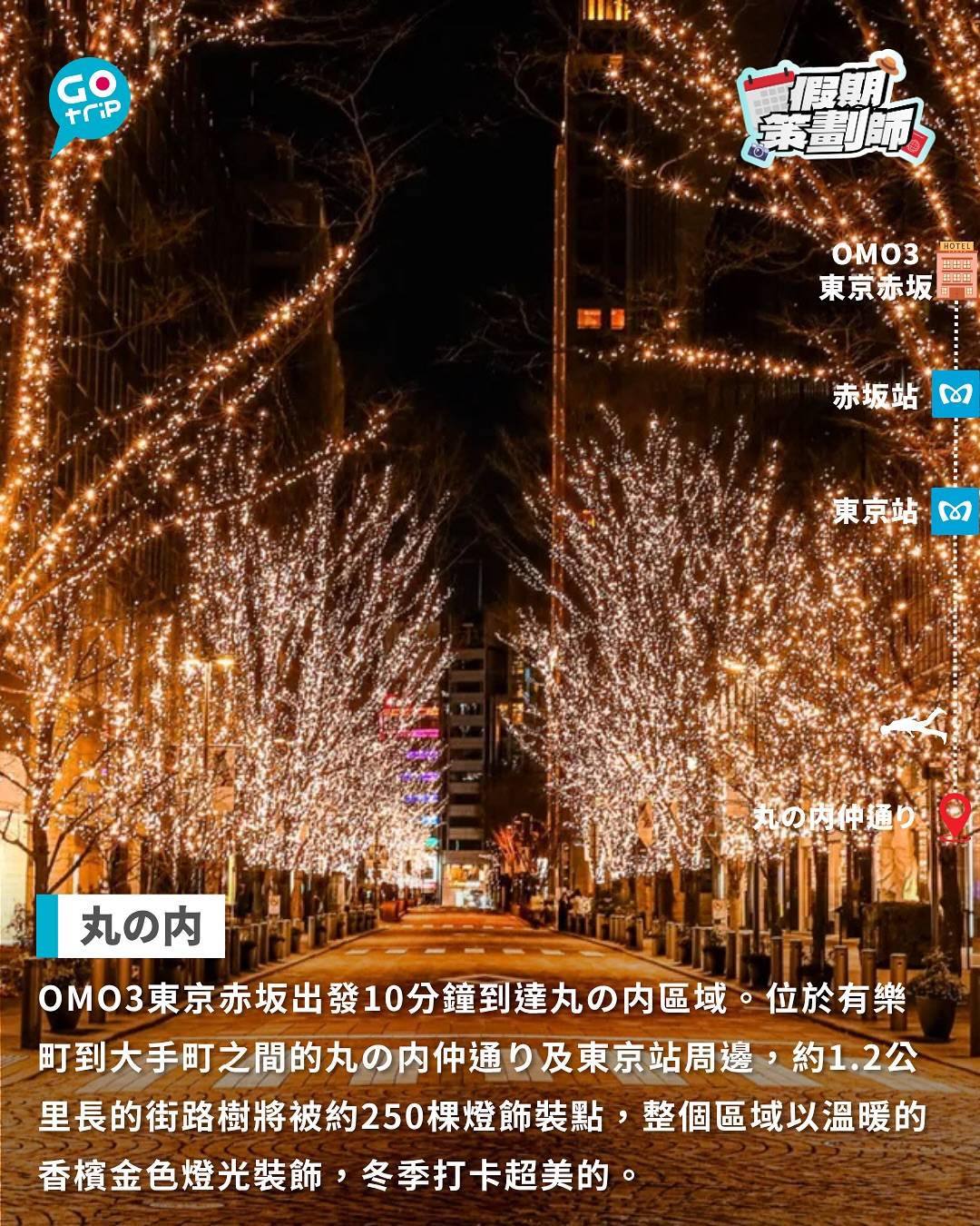 OMO3東京赤坂出發10分鐘到達丸の内區域。位於有樂町到大手町之間的丸の内仲通り及東京站周邊,約1.2公里長的街路樹將被約250棵燈飾裝點,整個區域以溫暖的香檳金色燈光裝飾,冬季打卡超美的。