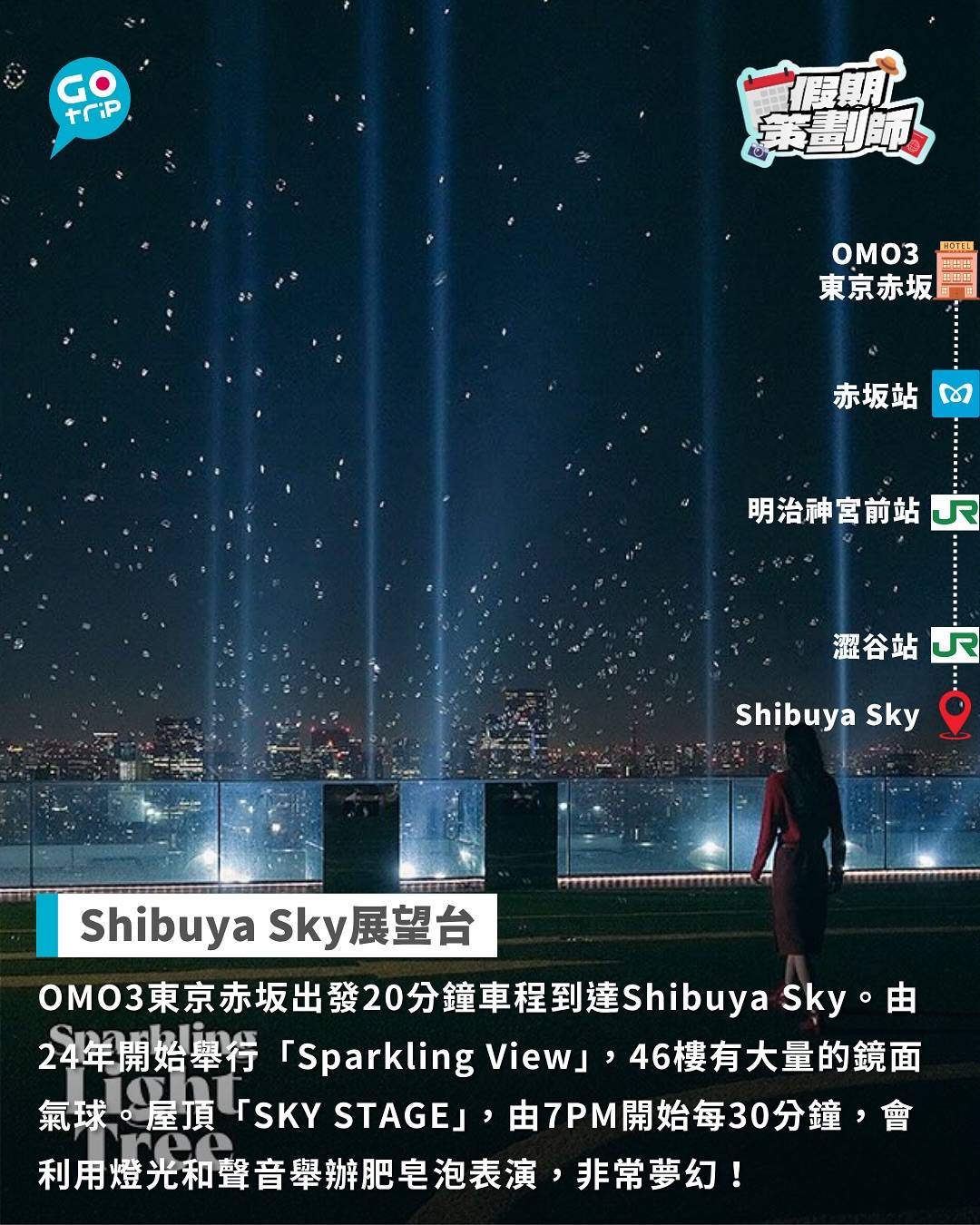 OMO3東京赤坂出發20分鐘車程到達Shibuya Sky。由24年開始舉行「Sparkling View」,46樓有大量的鏡面氣球。屋頂「SKY STAGE」,由7PM開始每30分鐘,會利用燈光和聲音舉辦肥皂泡表演,非常夢幻!