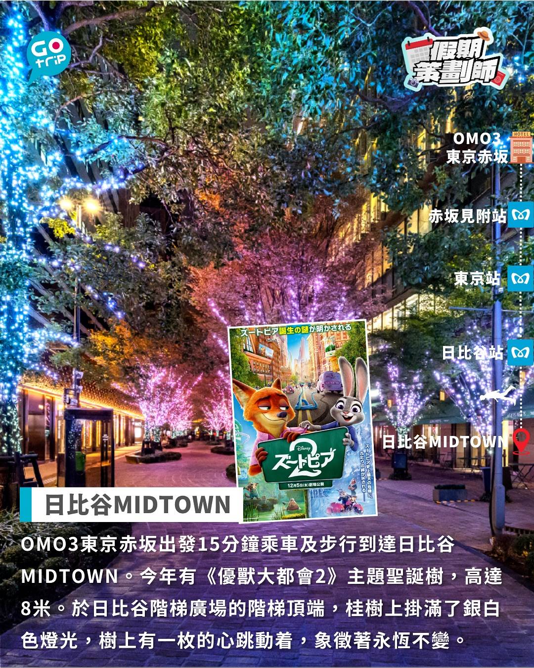 OMO3東京赤坂出發15分鐘乘車及步行到達日比谷MIDTOWN。今年有《優獸大都會2》主題聖誕樹,高達 8米。於日比谷階梯廣場的階梯頂端,桂樹上掛滿了銀白色燈光,樹上有一枚的心跳動着,象徵著永恆不變。