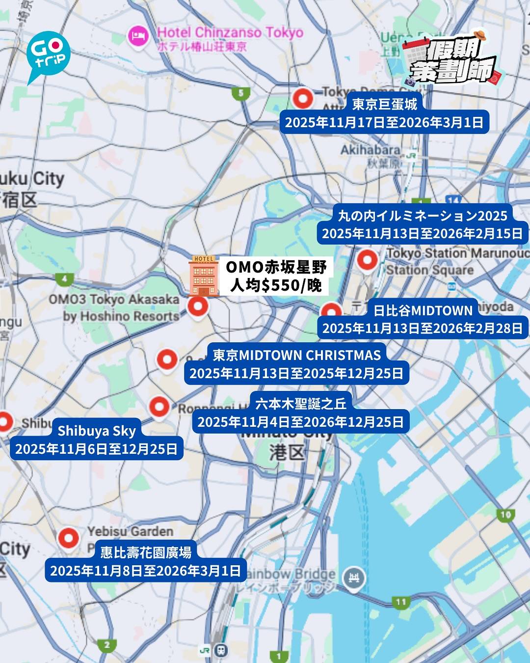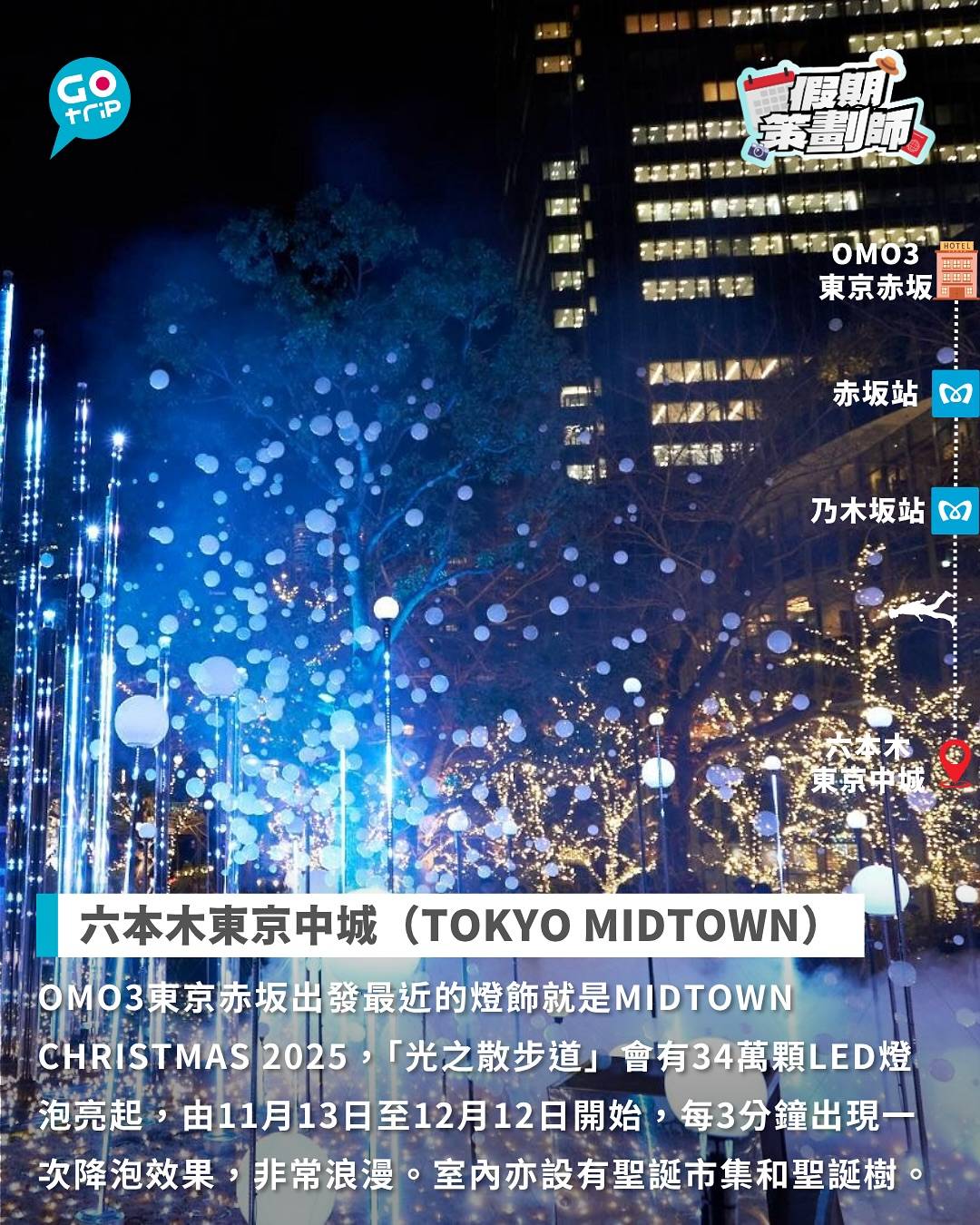 OMO3東京赤坂出發最近的燈飾就是MIDTOWN CHRISTMAS 2025,「光之散步道」會有34萬顆LED燈泡亮起,由11月13日至12月12日開始,每3分鐘出現一次降泡效果,非常浪漫。室內亦設有聖誕市集和聖誕樹。