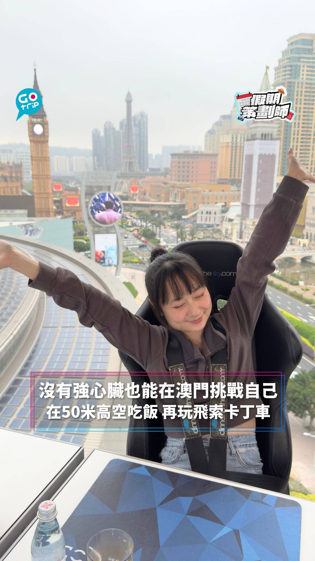 如果你沒有強心臟,但又想來點刺激體驗跳出舒適圈,不妨跟著這個BB班澳門挑戰行程!你可以在離地50米高空喝下午茶、吃晚飯 @dinnerinthesky_mo ,也可以玩飛索 @zipcity_macau 、卡丁車 @funfunkart ,感受速度。