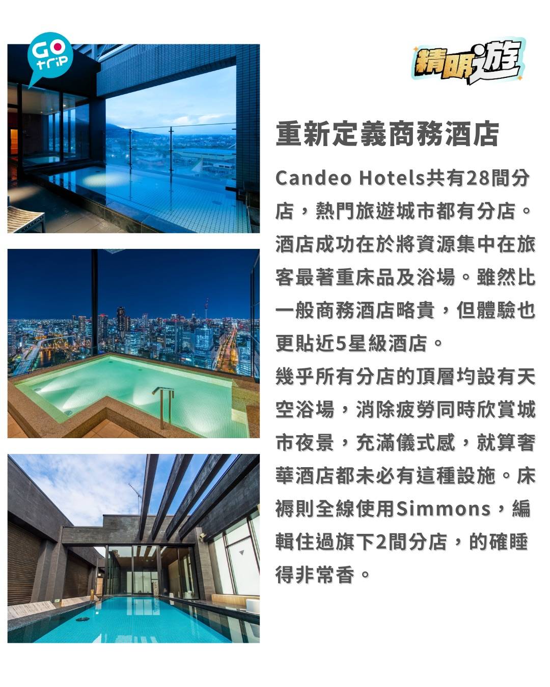 幾乎所有分店的頂層均設有天空浴場,消除疲勞同時欣賞城市夜景,充滿儀式感,就算奢華酒店都未必有這種設施。床褥則全線使用Simmons,編輯住過旗下2間分店,的確睡得非常香。