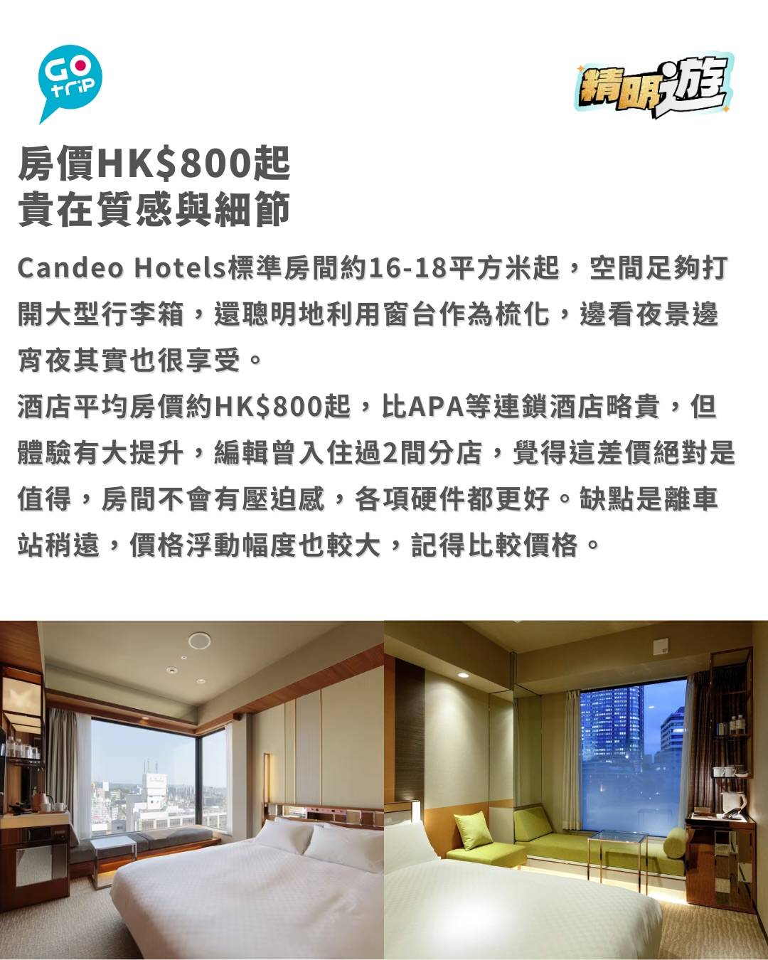 酒店平均房價約HK$800起,比APA等連鎖酒店略貴,但體驗有大提升,編輯曾入住過2間分店,覺得這差價絕對是值得,房間不會有壓迫感,各項硬件都更好。缺點是離車站稍遠,價格浮動幅度也較大,記得比較價格。