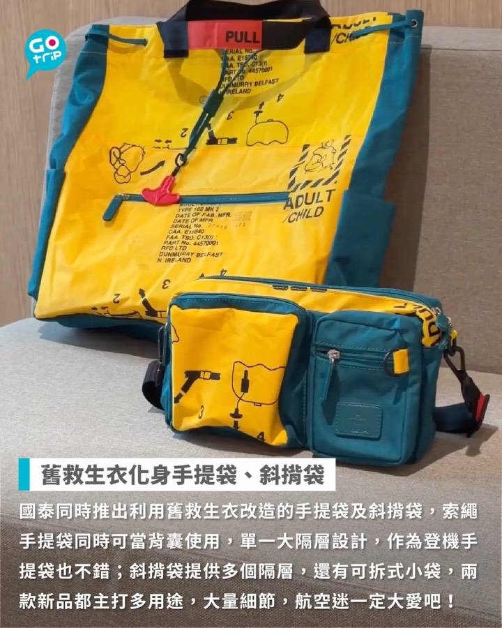 國泰同時推出利用舊救生衣改造的手提袋及斜揹袋,索繩手提袋同時可當背囊使用,單一大隔層設計,作為登機手提袋也不錯;斜揹袋提供多個隔層,還有可拆式小袋,兩款新品都主打多用途,大量細節,航空迷一定大愛吧!
