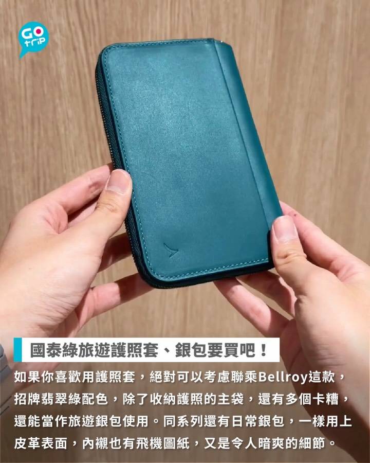 如果你喜歡用護照套,絕對可以考慮聯乘Bellroy這款,招牌翡翠綠配色,除了收納護照的主袋,還有多個卡糟,還能當作旅遊銀包使用。同系列還有日常銀包,一樣用上皮革表面,內襯也有飛機圖紙,又是令人暗爽的細節。