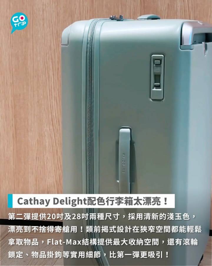 國泰 @CathayShop x Samsonite @samsonite_hk 行李箱第二彈提供20吋及28吋兩種尺寸,採用清新的淺玉色,漂亮到不捨得寄艙用!類前揭式設計在狹窄空間都能輕鬆拿取物品,Flat-Max結構提供最大收納空間,還有滾輪鎖定、物品掛鉤等實用細節,比第一彈更吸引!