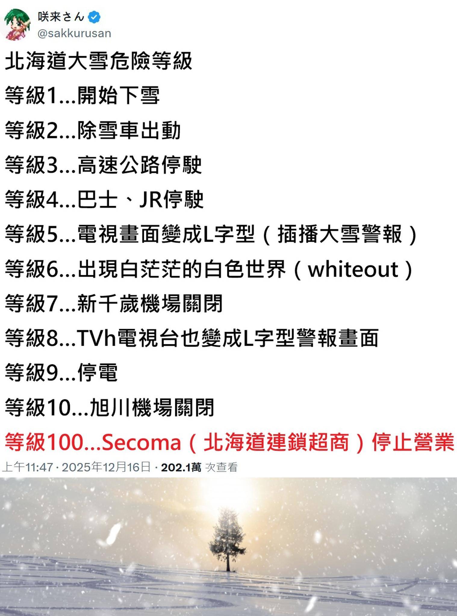 根據這份在社交媒體廣泛流傳的北海道大雪危險等級表,共分為11個等級,每個等級都有明確的判斷標準。等級1是開始下雪,等級2是除雪車出動,等級3時高速公路停駛,等級4則是巴士和JR停駛。當達到等級5時,電視畫面會變成L字型插播大雪警報,等級6出現白茫茫的白色世界,等級7新千歲機場關閉,等級8連TVh電視台也變成L字型警報畫面,等級9停電,等級10旭川機場關閉。最令人意外的是,等級100竟然是北海道連鎖超商Secoma停止營業,被網民戲稱為「末日級別」的指標。