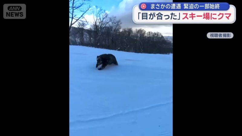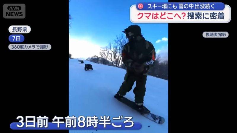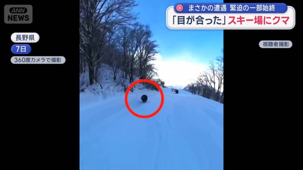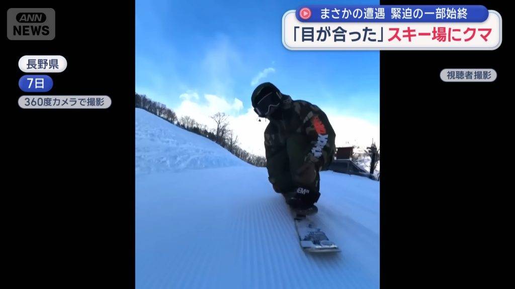 事發在12月7日早上約8點半,一名日本男子正在長野縣白馬地區的滑雪場享受滑雪樂趣,並用360度全景攝影機記錄過程。從他公開的影片可見,當他滑行約40秒後,左後方雪地突然竄出一頭體型龐大的黑熊,並以驚人速度向他直衝而來!當時附近纜車上的遊客也目睹了這驚心動魄的一幕,立即通報滑雪場。男子察覺到異樣後,不敢怠慢,立即加速滑走,成功擺脫巨熊的追擊,整個過程險象環生。