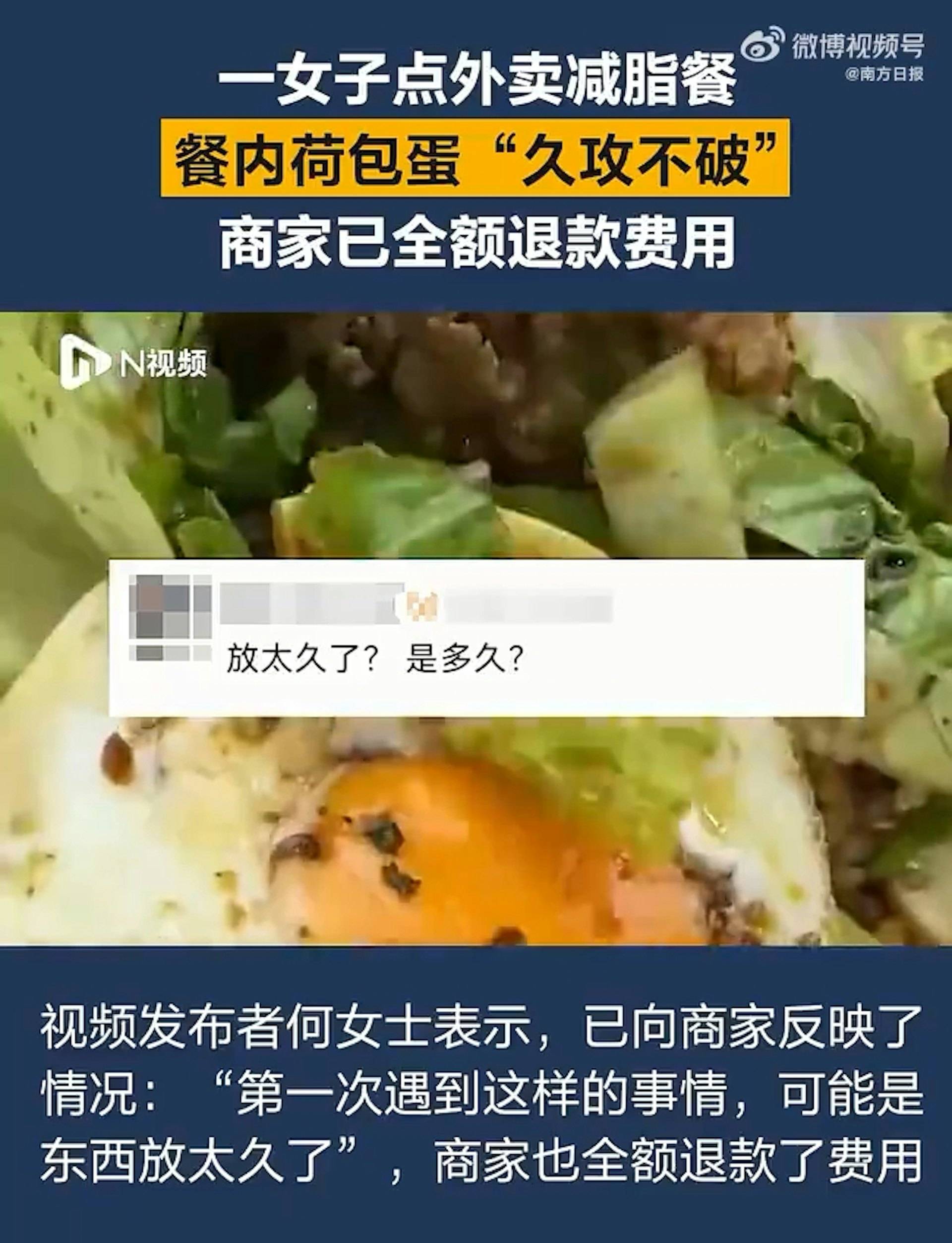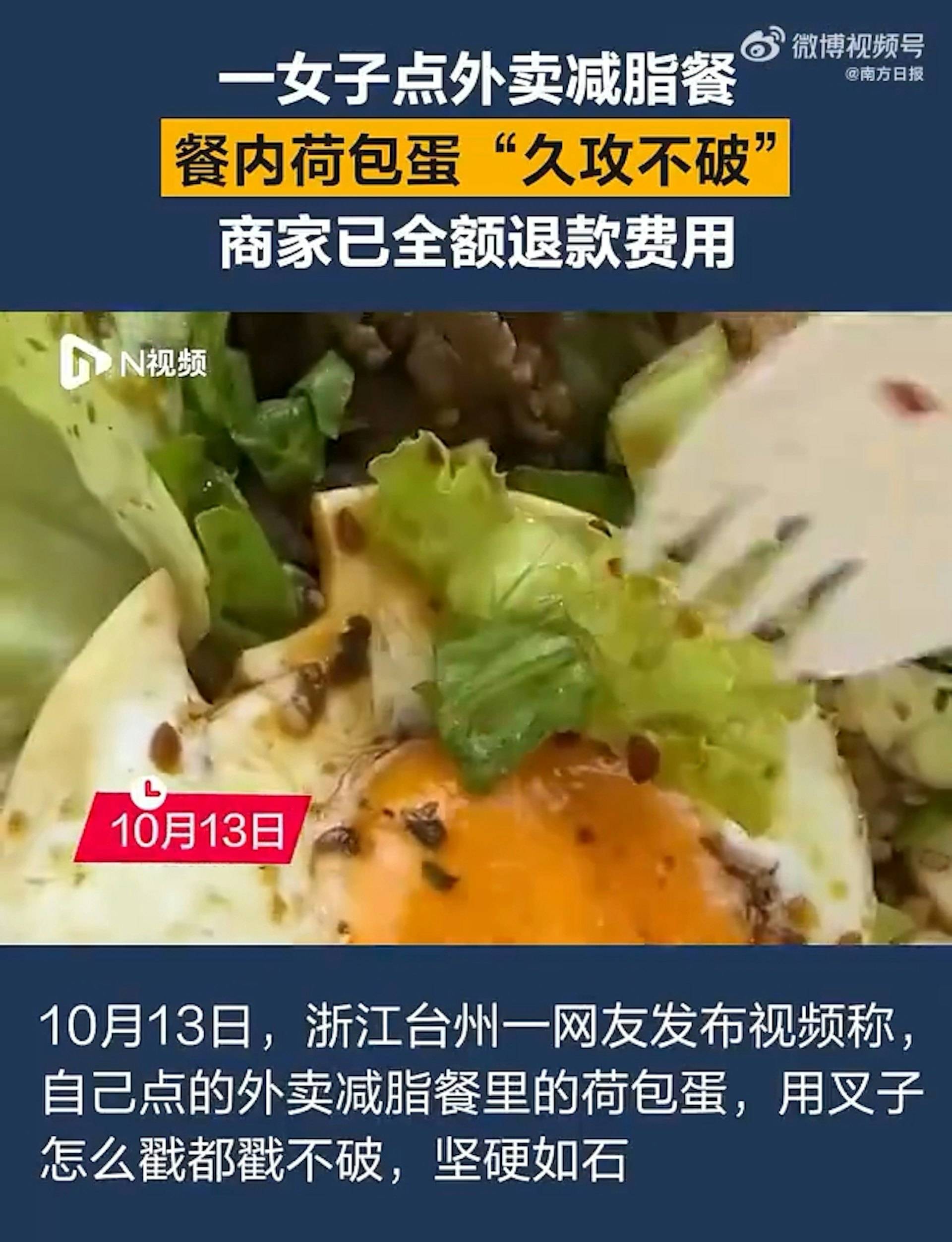 浙江台州一名何姓女子日前叫外賣點了減脂餐,沒想到餐點中的荷包蛋蛋黃竟然堅硬如塑膠,用叉子怎麼戳都戳不破。女子將影片上傳網絡後引發熱議,網民紛紛質疑這顆荷包蛋的真實性,事件發展令人意想不到。