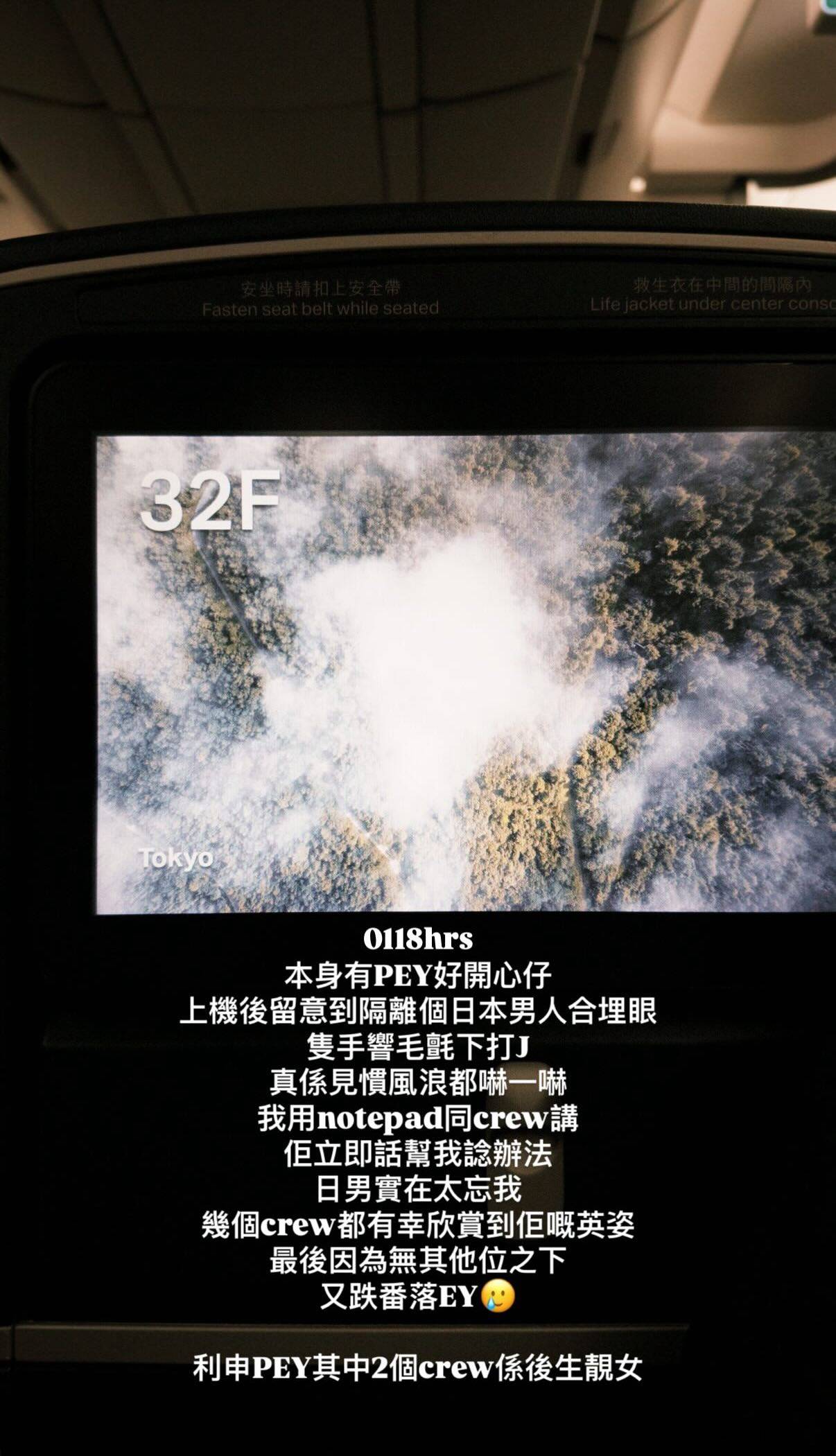 另一宗令人瞠目結舌的事件,是有網民在紅眼航班上目擊鄰座日本男乘客在座位上自慰。該網民表示,當時飛機尚未起飛,該名日本男子閉上眼睛,在毛氈掩護下進行不雅行為。事主用紙條通知機組人員,但該男子過於「忘我」,連幾名空姐都親眼目睹其「英姿」。由於航班客滿無法調位,事主最終被逼從特選經濟艙回到經濟艙。事主強調,有兩名機組人員還是年輕貌美的女性。