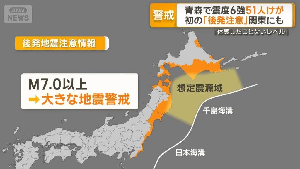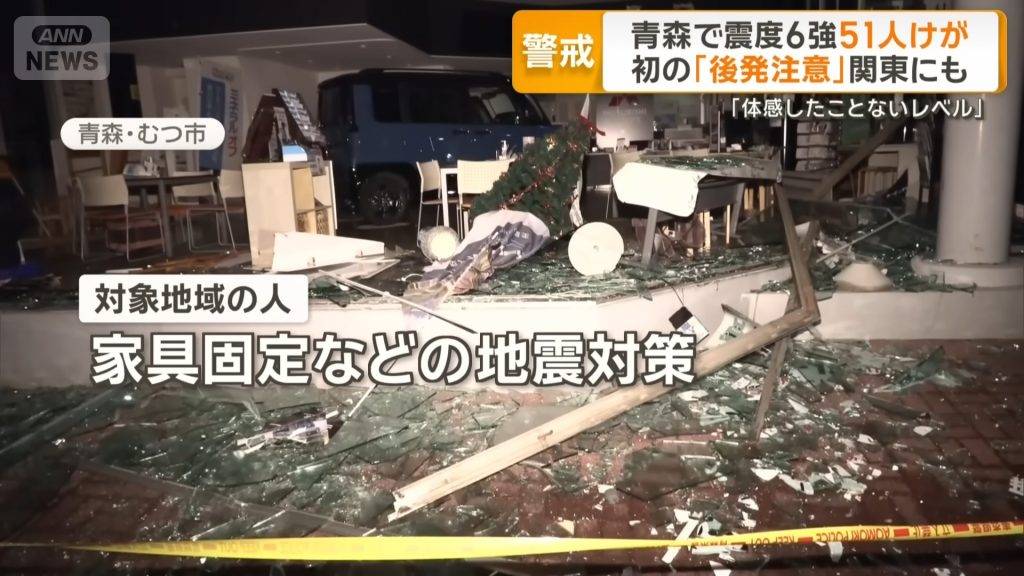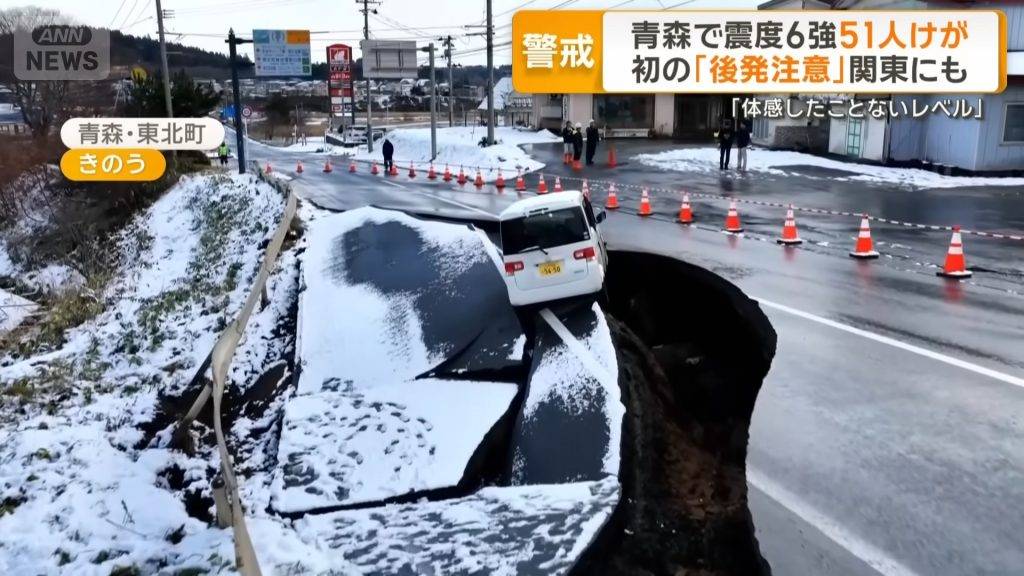 日本國土地理院透過分析震源周邊的電子基準點數據,發現震源附近的地殼出現明顯變動。其中青森縣東通村「東通2」觀測點顯示,錄得地殼向東移動長達約9厘米之多,數據相當驚人。當局補充指,數值或受儀器傾斜及周邊地盤影響,屬即時解析結果,仍需後續精密校正。但無論如何,已見震源周邊板塊活動相當劇烈,情況令人擔憂。今次地震中,青森縣八戶市錄得震度6強,是自今年元旦能登半島大地震以來日本境內最強烈的震動。