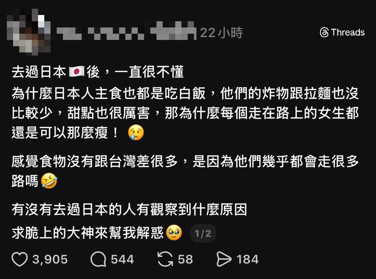 有網民一針見血地指出,日本社會對「變胖」的容忍度極低,這不是醫學而是現實。「衣服尺寸範圍小、同儕壓力強、體態是基本禮貌的一部分」,整個環境都在幫助她們限制攝取。日韓社會風氣比較重視外貌、穿搭及身材管理,加上烹飪方式較注重健康,不像其他地方便當菜肉先炸過再炒或滷,熱量相對較低。這種社會氛围令日本女生從小就養成控制體重的習慣。