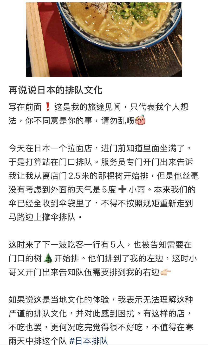 該名內地女遊客在社交平台分享經歷時表示,日本很多餐廳都會要求客人在戶外指定區域排隊,而非在店內等候。她認為這種安排對於「怕冷怕雨怕曬的朋友們」來說相當不便,認為餐廳應該更加體諒客人的感受。女遊客更進一步透露,經過漫長等候後品嚐拉麵,最終覺得味道並不理想,似乎對整個用餐體驗感到失望。這番言論迅速在網上傳播,引起不少關注和討論。