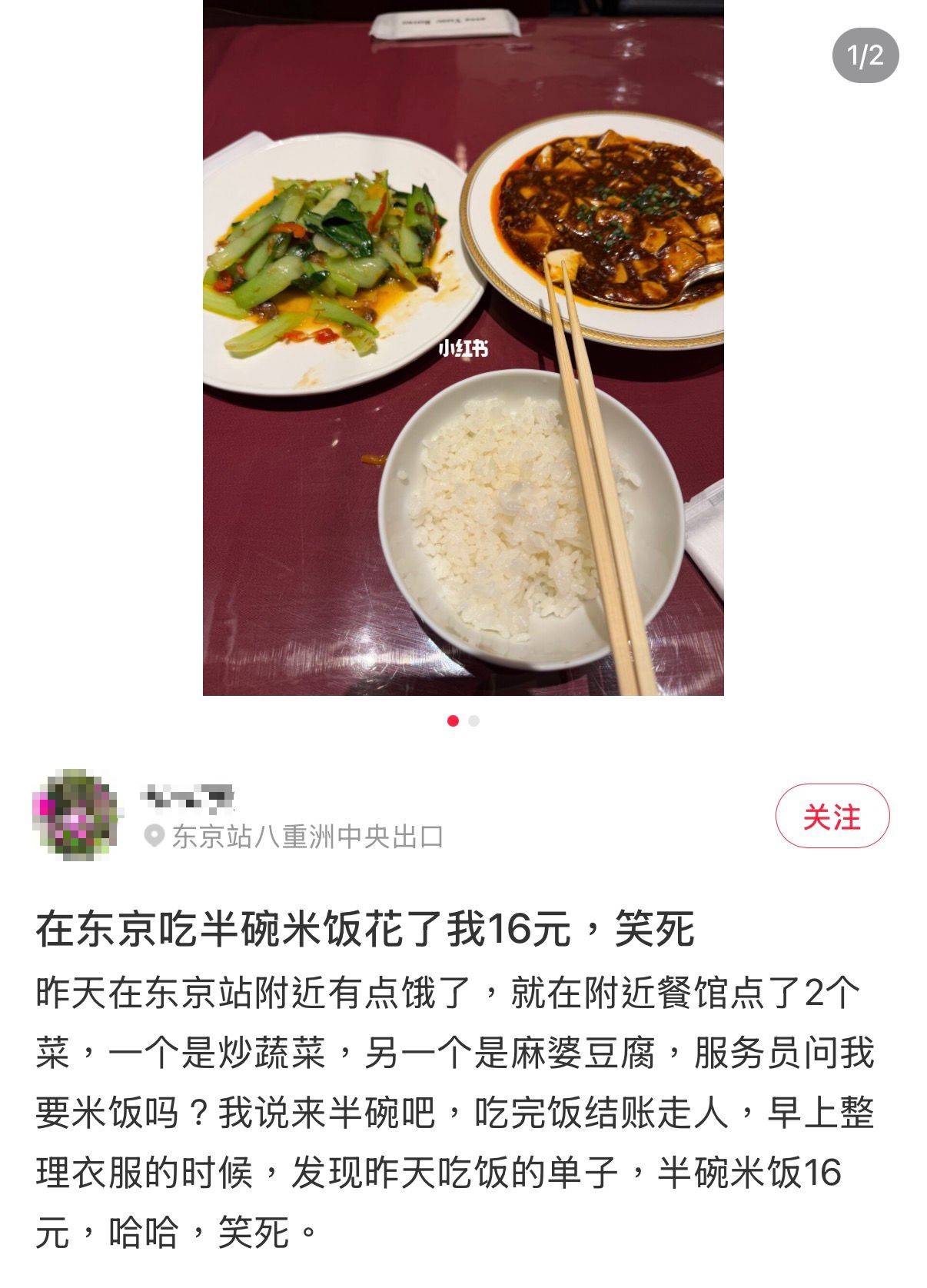 這名遊客在東京站附近一間中餐廳用餐,點了炒蔬菜和麻婆豆腐兩道菜。當服務員詢問是否需要米飯時,他要求「來半碗吧」。用餐結束後,他在整理衣服時發現收據,驚訝地發現半碗米飯收費300日圓,折合人民幣約16元。除了米飯外,麻婆豆腐收費1,800日圓(約80元人民幣),炒蔬菜則要1,500日圓(約66元人民幣),連一瓶可口可樂都要600日圓(約27元人民幣)。整頓飯下來總共花費4,200日圓,相當於約185元人民幣。