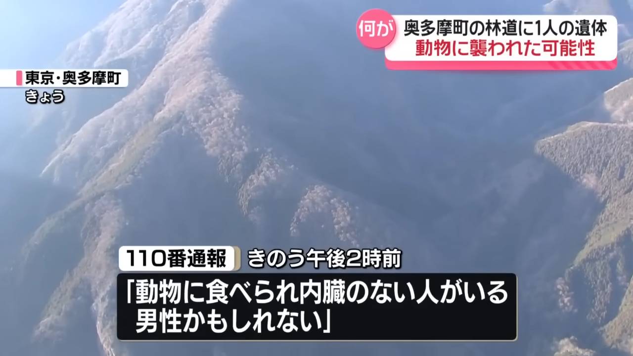 周二下午,有人在東京奧多摩町的小川谷林道上發現一具男性遺體,並立即報案稱「有人受傷了,他被動物吃掉了,內臟都不見了」。警視廳山岳救援隊翌日趕抵現場確認屍體,發現死者腹部被嚴重破壞,部分內臟已經掉失。現場慘烈程度令救援人員震驚,警方相信遺體曾被動物啃食過,目前已將屍體移送警署進行詳細調查。由於屍體上沒有任何可供識別的個人物品,警方暫時未能確認死者身份,亦無法確定襲擊的動物種類。