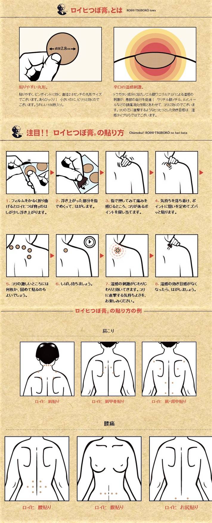 ROIHI-TSUBOKO穴位貼布每盒含156片,直徑2.8厘米的圓形貼布,售價約58至78港元。產品採用鋁箔夾鏈袋包裝,避免與空氣接觸影響效果,也不需要一次用完整盒。貼布適用於腰痛、背痛、頸部肩膀僵硬酸痛、肌肉酸痛、肌肉疲勞、腱鞘炎、拉傷、扭傷和關節痛等多種症狀。產品為日本製造,保質期相當長,品質有保證。