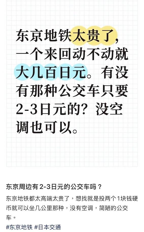 該名內地遊客在小紅書發文詢問「東京周邊有2-3日元的公交車嗎?」,更直言「東京地鐵都太高端太貴了,想找就是投兩個1塊錢硬幣就可以坐幾公里那種,沒有空調,簡陋的公交車。」帖文顯示他經常需要從埼玉到東京,但認為定期票「大幾萬,買不起」。這個要求立即引起網民熱議,有人直接回應「2-3日元在中國是1-1.5元,能坐公交嗎在國內?」更有網民諷刺「怎麼最近全是這種250的帖子」,暗指發文者是「二百五」。
