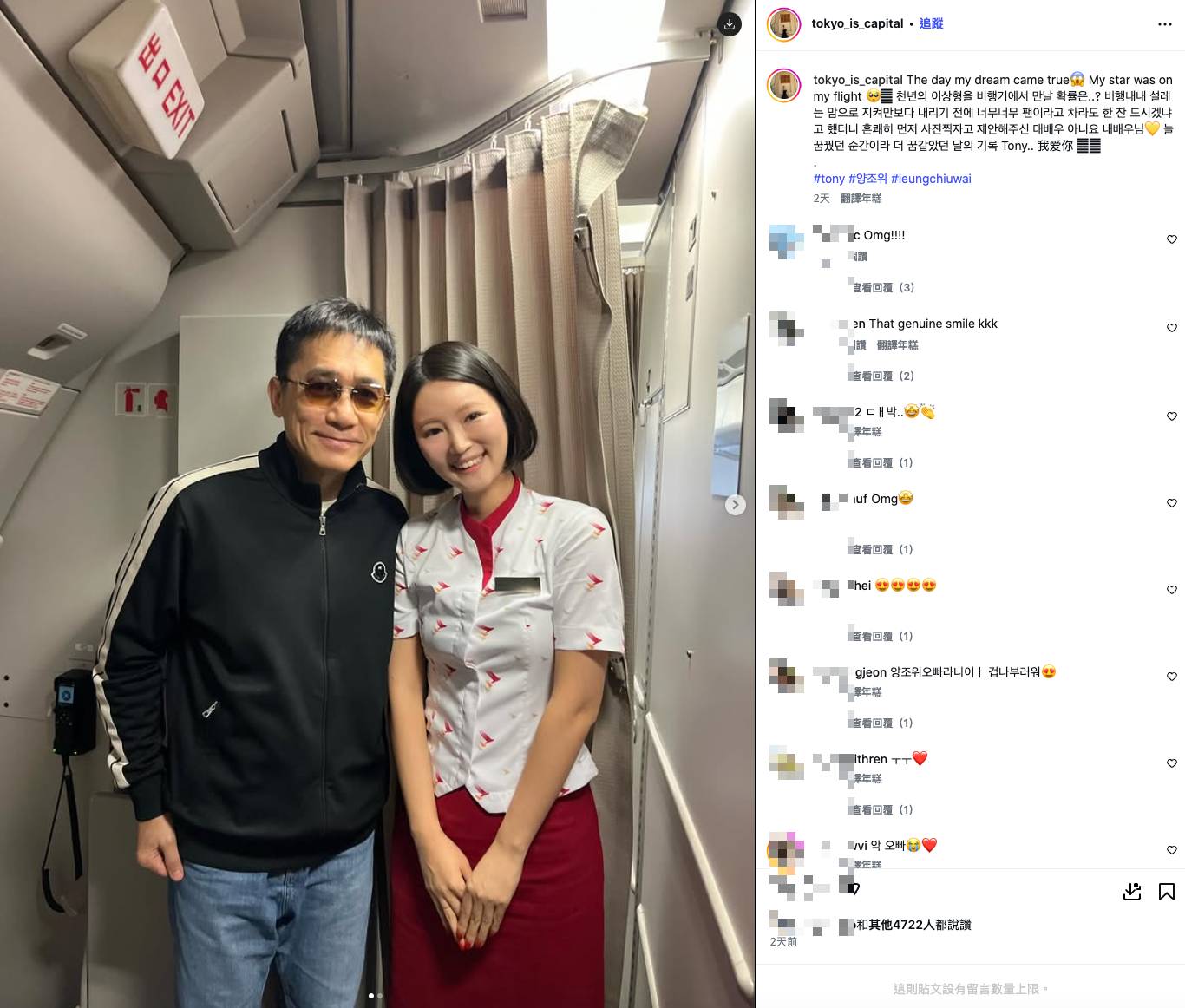 這名韓籍空姐在社交平台分享了這次夢幻般的經歷,表示當天發現梁朝偉就坐在機艙內時,整個人都興奮得不得了。她形容這是「千年難遇的理想型在飛機上相遇的機率」,整個航程都懷著忐忑不安的心情,只敢遠遠地偷看這位心中的男神。作為梁朝偉的忠實粉絲,她一直夢想著能夠親眼見到偶像,沒想到竟然在工作時遇上了。空姐透露自己內心非常掙扎,既想要上前搭話,又怕打擾到對方,只能在執勤期間偷偷關注著梁朝偉的一舉一動。