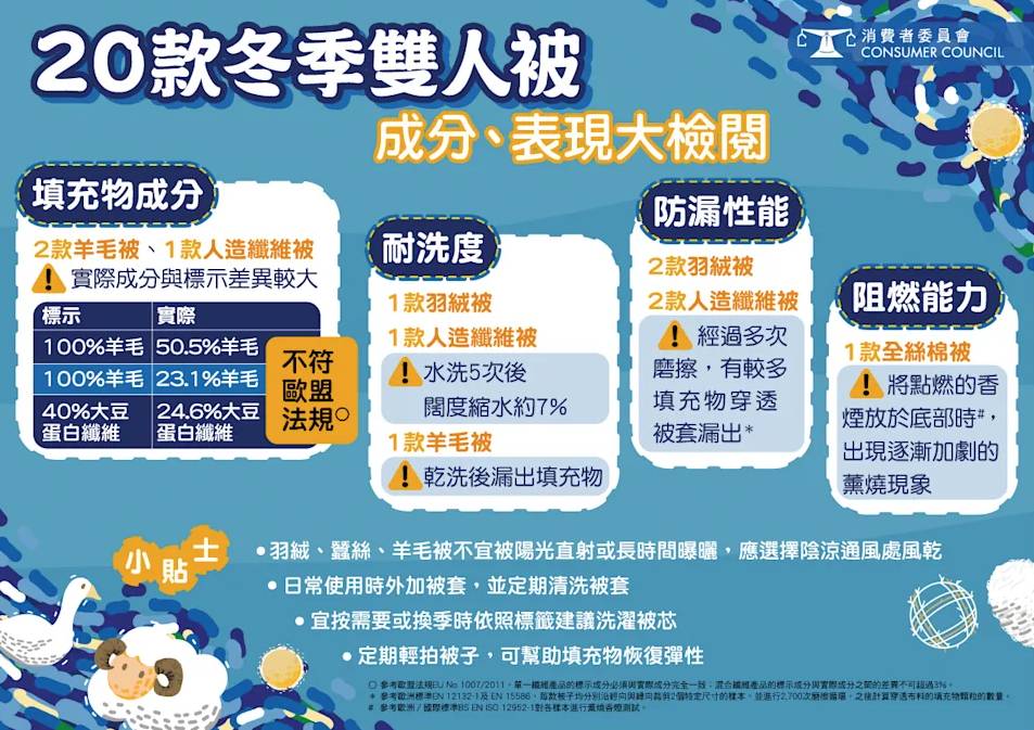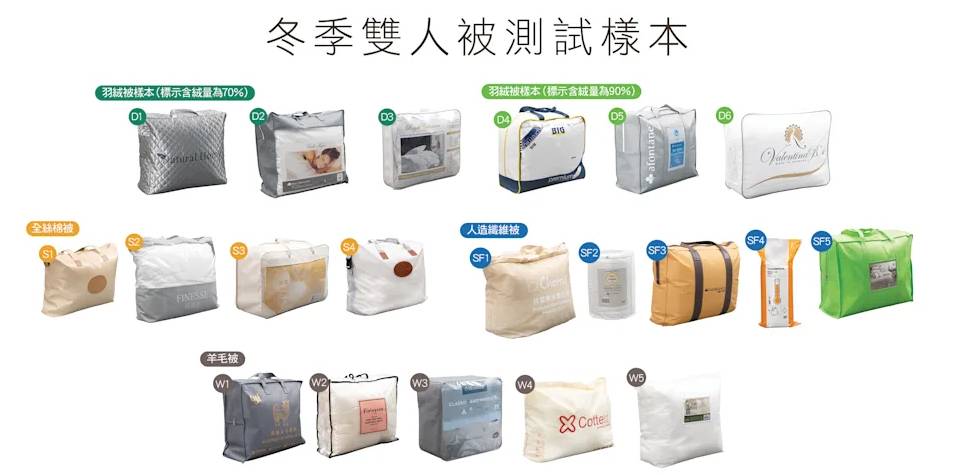 消委會從百貨公司、床上用品專門店及家品店購入20款雙人被樣本進行測試,涵蓋羽絨被、全絲棉被、人造纖維被及羊毛被4種類別。測試發現,有3款樣本的實際填充物成分與標示差異甚大,完全不符合歐盟法規的規定。其中最嚴重的是POLOTEX Pure Wool Comforter,標示為100%羊毛,但實際檢出羊毛成分只佔23.1%,與標示相差高達76.9%。另一款Cottex抗菌100%純羊毛被同樣標示100%羊毛,但實際羊毛成分只有50.5%,含有聚酯纖維。此外,Collection de Chambre Natural Soy Bean Quilt標示含有40%大豆蛋白纖維,但實際檢出僅為24.6%,相差15.4%。