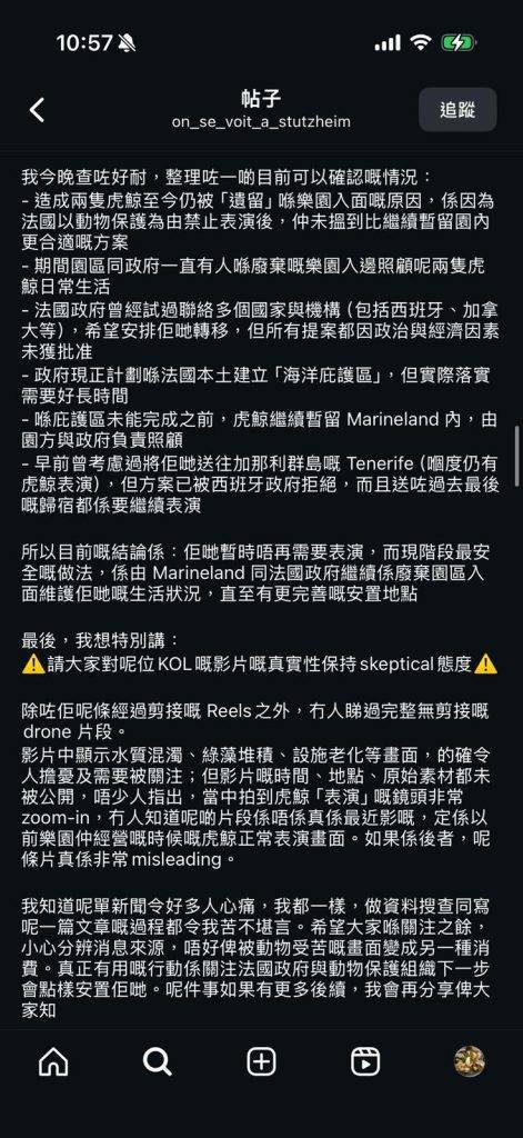 這位旅法港人特別提醒大家對該KOL影片的真實性保持懷疑態度。除了這條經過剪接的影片外,沒有人看過完整無剪接的無人機片段。影片中顯示水質混濁、綠藻堆積、設施老化等畫面確實令人擔憂,但影片的時間、地點、原始素材都未被公開。當中,拍到虎鯨「表演」的鏡頭非常zoom-in,沒有人知道這些片段是否真的是最近拍攝,還是以前樂園仍在經營時的虎鯨正常表演畫面。有網民留言表示「係咪剪接過重要咩?咁果兩條虎鯨比人留左係個廢棄樂園係咪事實呀?」也有網民感謝詳細資料整理,指「知道仍有人照顧,太好了」。另外有法國當地網民補充,上星期TF1電視台8點新聞曾經報道過,園主表示仍然有34位受薪人士照顧殺人鯨及海豚,並希望政府盡快安排解決方案。