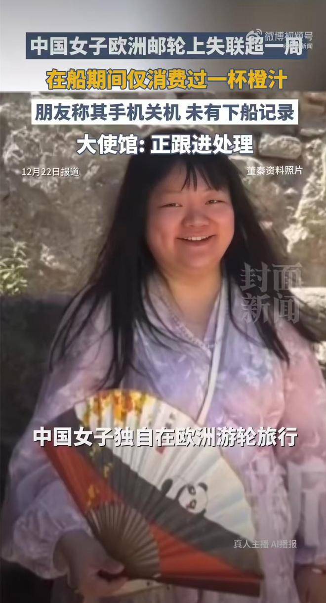 失蹤女子董秦(音譯)12月10日上午在西班牙馬略卡帕爾馬港口登上愛達月光號郵輪,計劃進行地中海航線旅行。然而12月12日郵輪停靠法國馬賽港後,她便神秘消失。郵輪公司證實,秦冬從未辦理過正式下船手續,但船上紀錄顯示她的房卡在當日清晨6時後便再無任何使用痕跡。更令人費解的是,她在整個航程中僅產生一筆消費紀錄,就是購買了一杯橙汁,並非酒精飲料。客艙內發現她的行李箱等私人物品,現場沒有打鬥痕跡,排除了突發衝突的可能性。