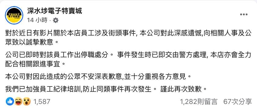 昨晚九時半左右,深水埗電子特賣城在其官方Facebook發出聲明,三度向相關人士及公眾致歉,「對員工涉及街頭事件深感遺憾,向相關人士及公眾致以誠摯歉意」,並宣布已即時對涉事員工作出停職處分。特賣城強調十分重視各方意見,對事件「造成的公眾不安深表歉意」,承諾會全力配合相關跟進事宜,並加強員工紀律培訓以防止同類事件再次發生。聲明最後以「謹此再次致歉」結尾,全文如下: