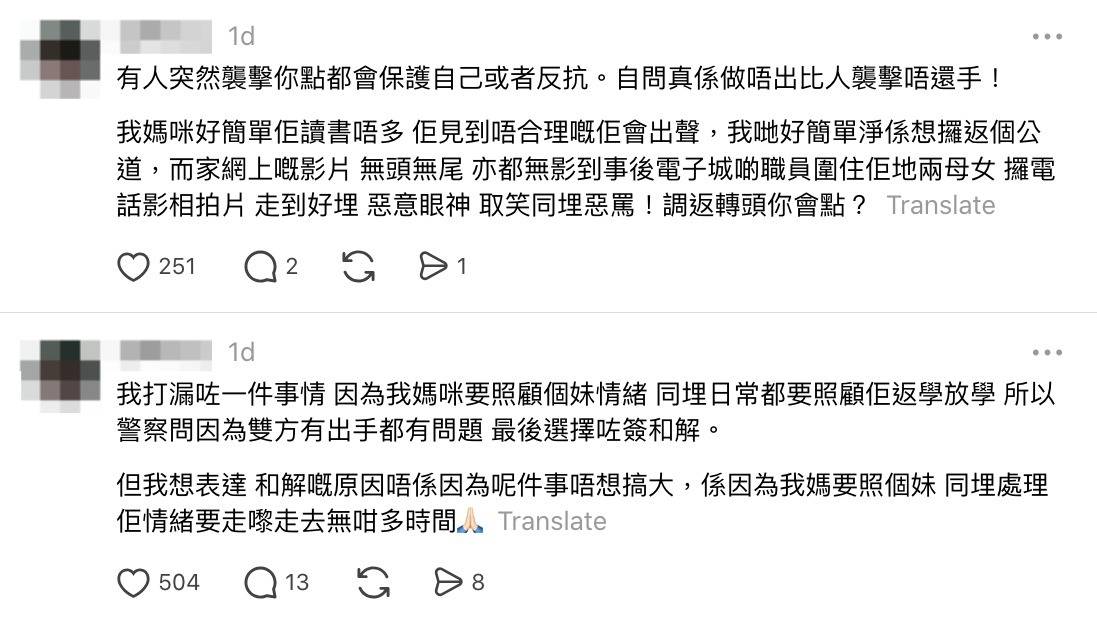 事件發生後,涉事母女的家人在網上現身澄清事件真相,強調「我哋好簡單淨係想攞返個公道」。自稱是小女孩的哥哥「現身」親自發文透露事發經過,母親當時是排隊幫妹妹買雪糕,因為妹妹在旁邊等候不知道要選什麼口味,所以母親走前到收銀處幫忙選擇,因此「行歪咗條隊」。他表示當時已有人質疑母親插隊,母親亦有解釋原因,但電子城女職員其後走出來「撞/推開佢」,才引發衝突。該名家人承認母親還手不對,但強調「從小到大佢都好錫我哋幾兄弟姊妹,可以講嘅係我哋條命大過佢」,希望網民理解母親保護女兒的心情。