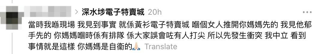 一名自稱「中立」的目擊者透露事發經過:「當時我喺現場 我見到事實 就係黃衫電子特賣城 嗰個女人推開你媽媽先的 我見他郁手先的 你媽媽嗰時係有排隊 係大家誤會咗有人打尖 所以先發生衝突 我中立 看到事情就是這樣 你媽媽是自衞的」, 並再次留言強調「必定要公開道歉 還返人哋母女一個公道」。此外,其他網民都紛紛表示「見到事實真係要出聲」。