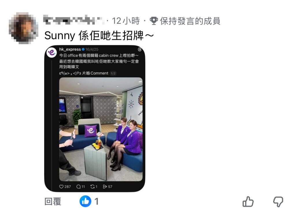 不少網民好奇Sunny工作的航線,紛紛表示想買機票朝聖。從Sunny的IG可見,她除了香港,亦不時到訪日本、韓國、泰國,甚至印尼、澳洲等地,大家幸運的話或許能遇見Sunny。
