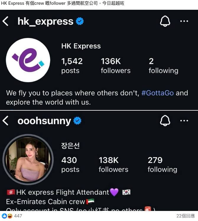 有網民在FB群組開Post,發現這位在Instagram上使用「ooohsunny」帳戶名稱的韓籍空姐,其追蹤者人數已經達到138K人,超越了香港快運航空公司官方帳戶的136K名追蹤者。張恩善在個人簡介中表明自己是香港快運的空中服務員,同時也是前阿聯酋航空的機艙服務員。她特別強調這是她在社交網絡上的唯一官方帳戶,並警告追蹤者注意其他冒充帳戶。