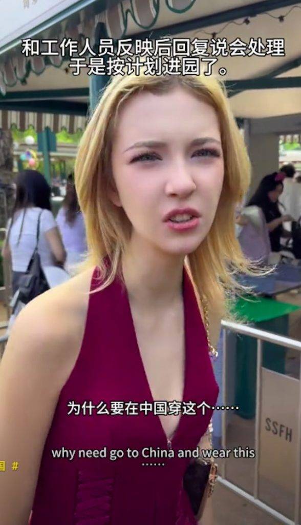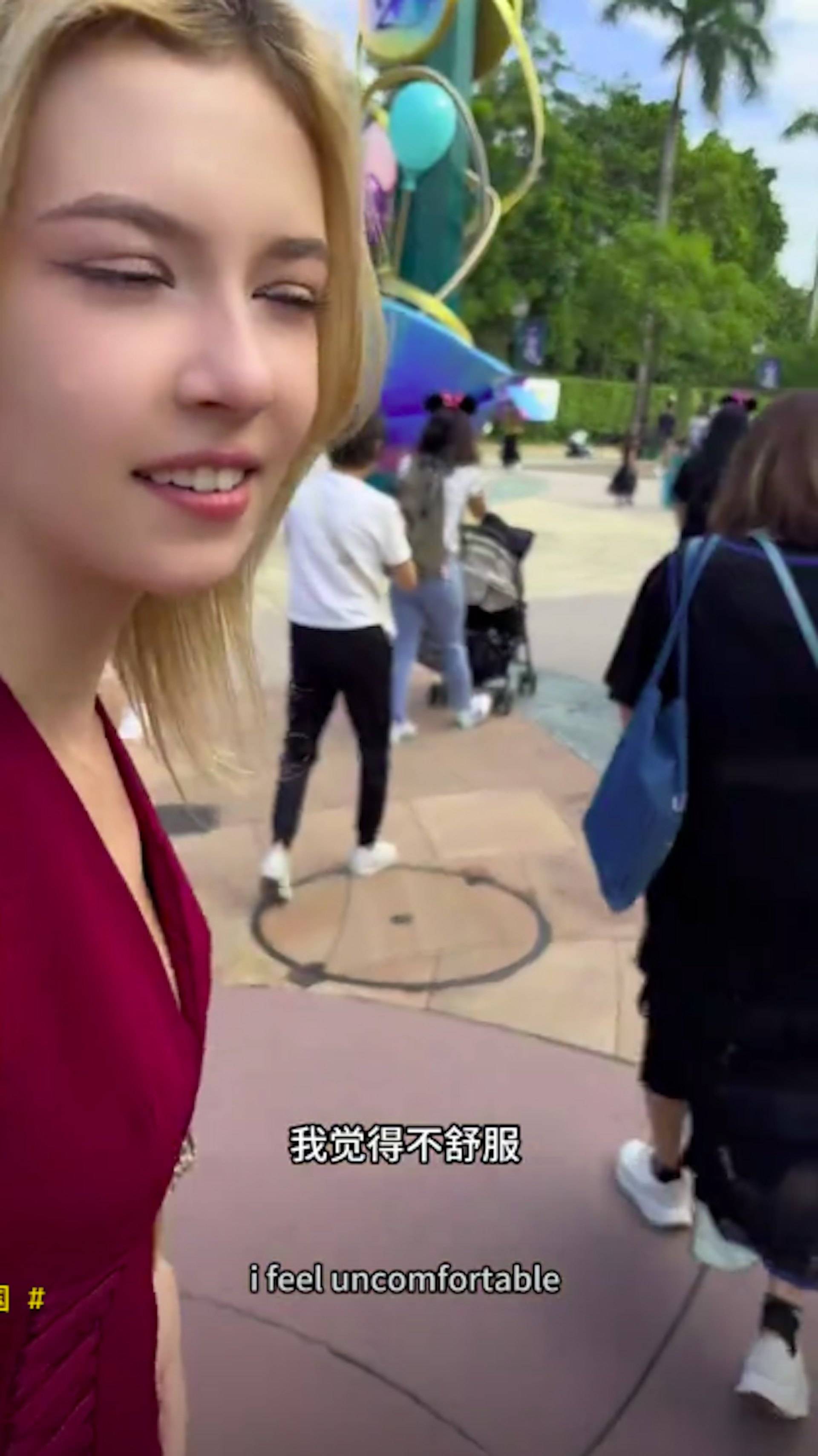 影片顯示,這對中俄情侶原本在香港迪士尼樂園門口興高采烈地談論進入園區的角色扮演者衣著,突然間臉色大變。男方更高呼「What the fuxk」,原來他們目擊一名帶著操粵語妻兒的男子,穿上貌似日軍裝扮,且腰間束有佩刀,緩緩走進迪士尼樂園。俄籍女友見狀露出誇張「O嘴」表情,並用雙手掩嘴表示要回家,男方則直指「I feel uncomfortable」。女方更批評該男子操守有問題,質疑「為什麼要在中國穿這個」,又聲言「我怎麼可以停止和他呼吸相同的空氣」。