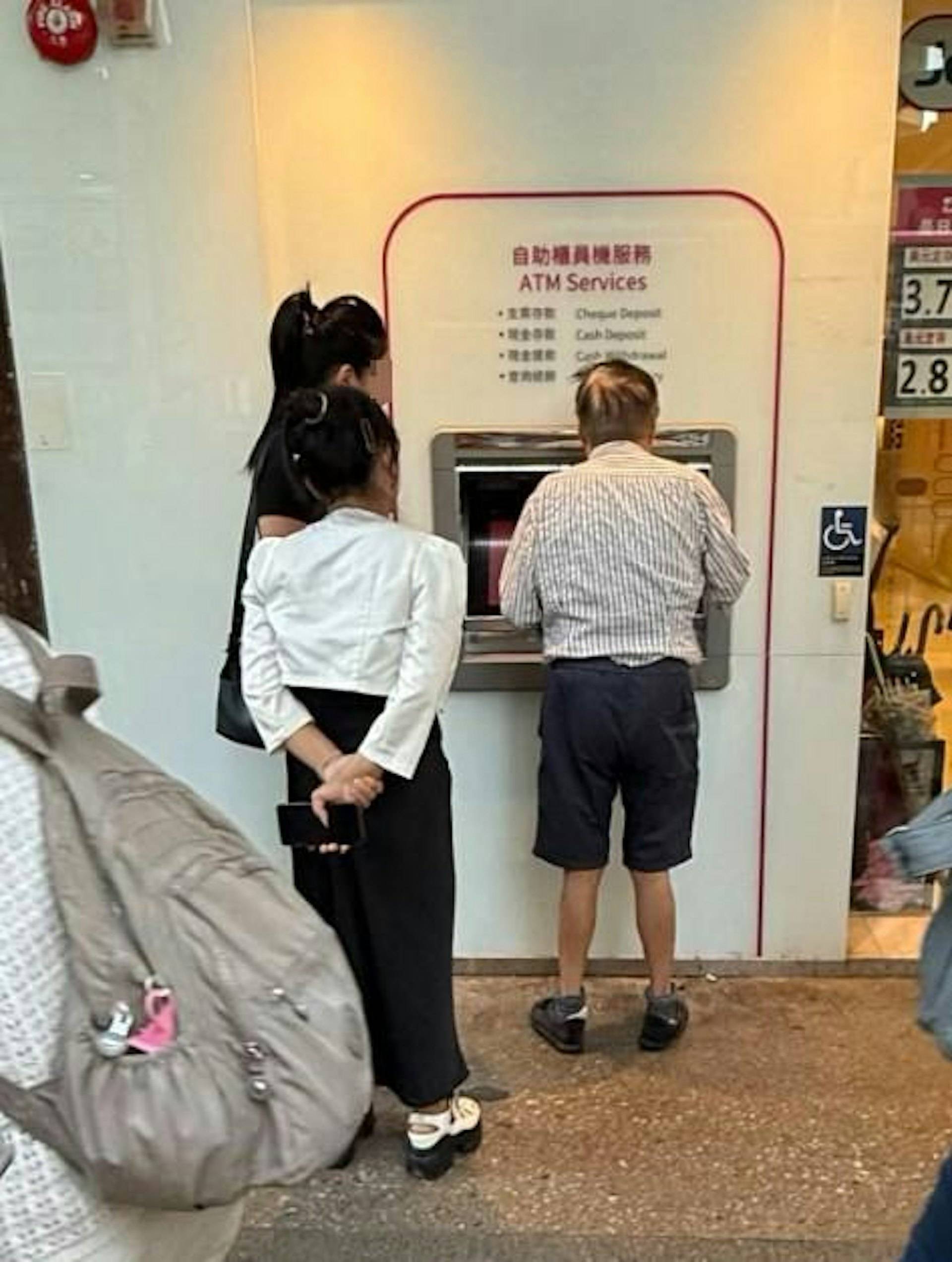 目擊港男在threads帳號「24×24」上傳的照片顯示,一名老伯正在使用櫃員機取錢,旁邊分別站了兩名身穿黑衫及白衫的女子。最令人起疑的是,其中黑衣女子「火眼金睛」直視櫃員機顯示器,甚至將手伸至數字鍵盤上方,整個畫面看起來極不尋常。港男拍下照片後疑惑詢問「到底係叫X唔俾錢定桃色騙案呀?」,認為事有蹊蹺。從相片可見,兩名女子的站位和動作都顯得相當可疑,令人不禁懷疑是否涉及不當行為。